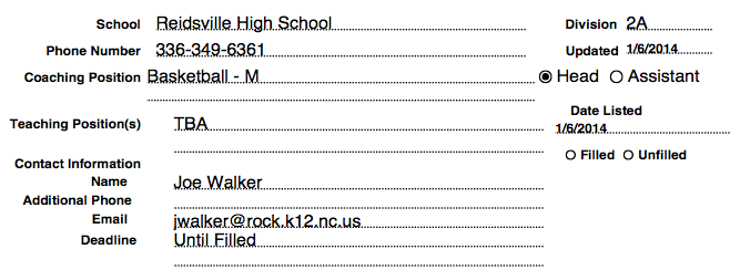 Job- Reidsville HS (NC) Head Boys Basketball Coach